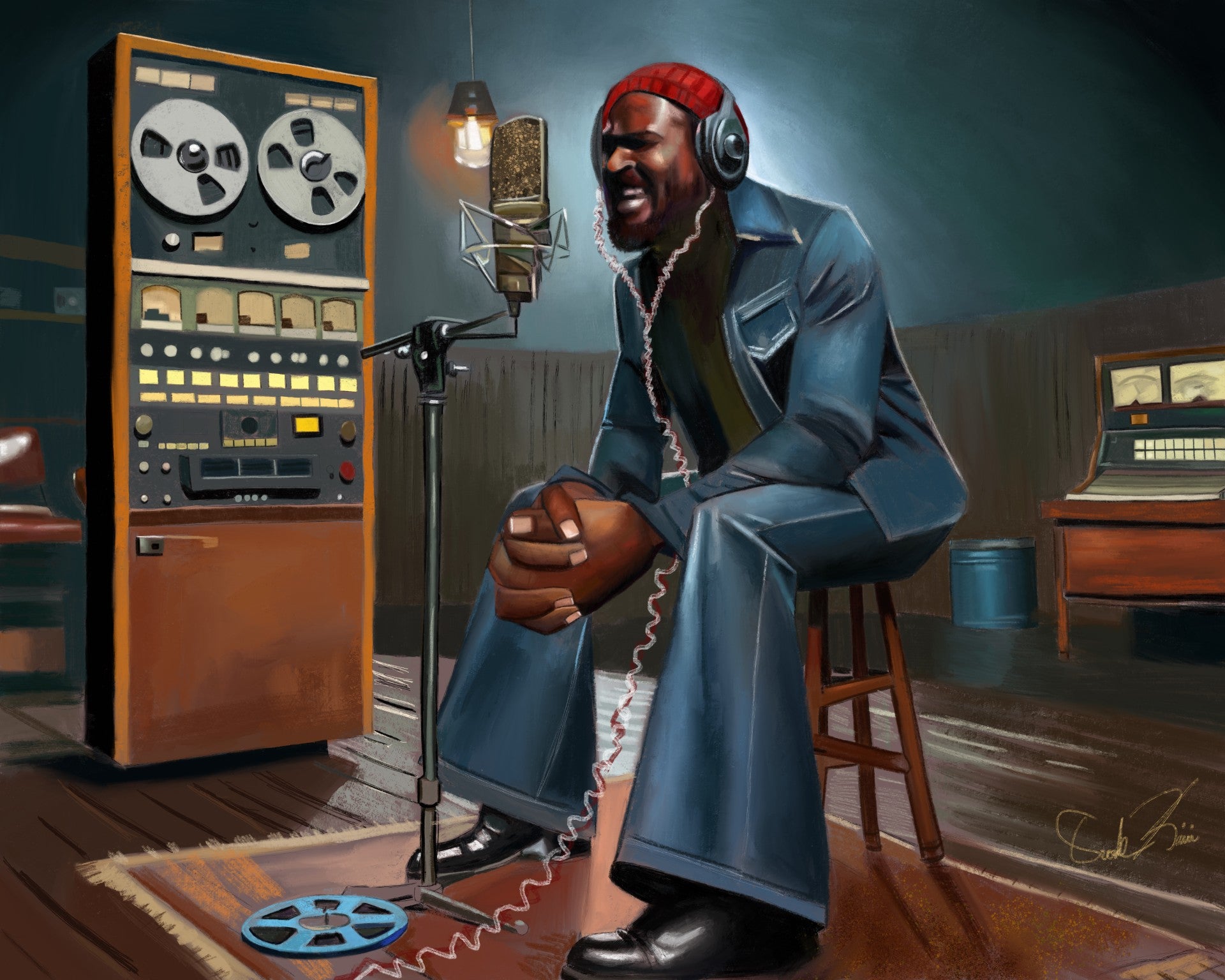 The first painting in a series of illustrations by Oronde Kairi, Marvin Gaye Studio Session #1 pays homage to the legendary Marvin Gaye as he creates one of his timeless masterpieces-the Let's Get It On album. Dressed in his iconic denim outfit and red skull cap, Marvin sits in his personal studio, known as "Marvin's Room," with his hands clutched together, lost in the depths of his music. His soulful expression captures the passion and artistry that define his sound, bringing to life a moment of pure creative brilliance.