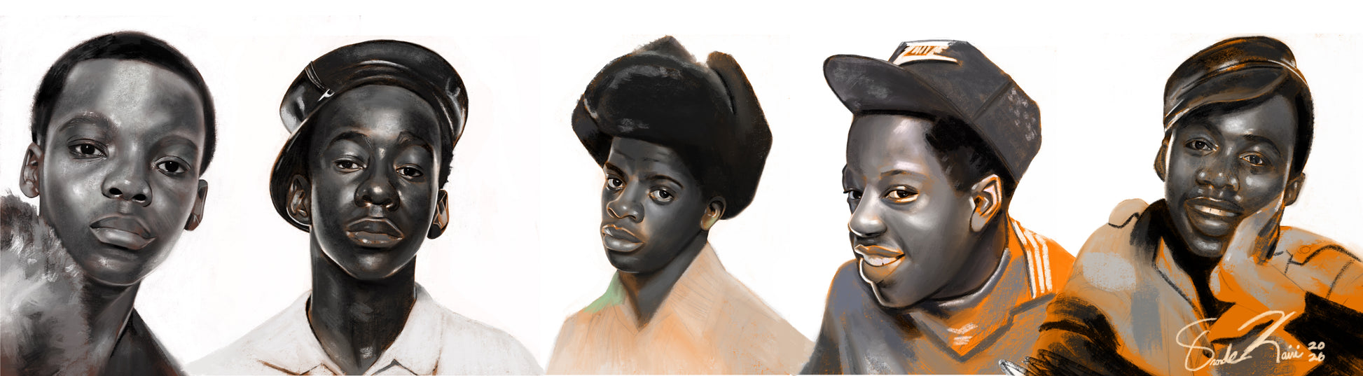 This drawing captures New Edition at the very beginning of their journey in 1983- five young faces full of innocence, confidence, and raw potential. Rendered in soft yet powerful grayscale with warm accents, the piece reflects the group before fame fully shaped them, when talent, brotherhood, and youthful dreams led the way.