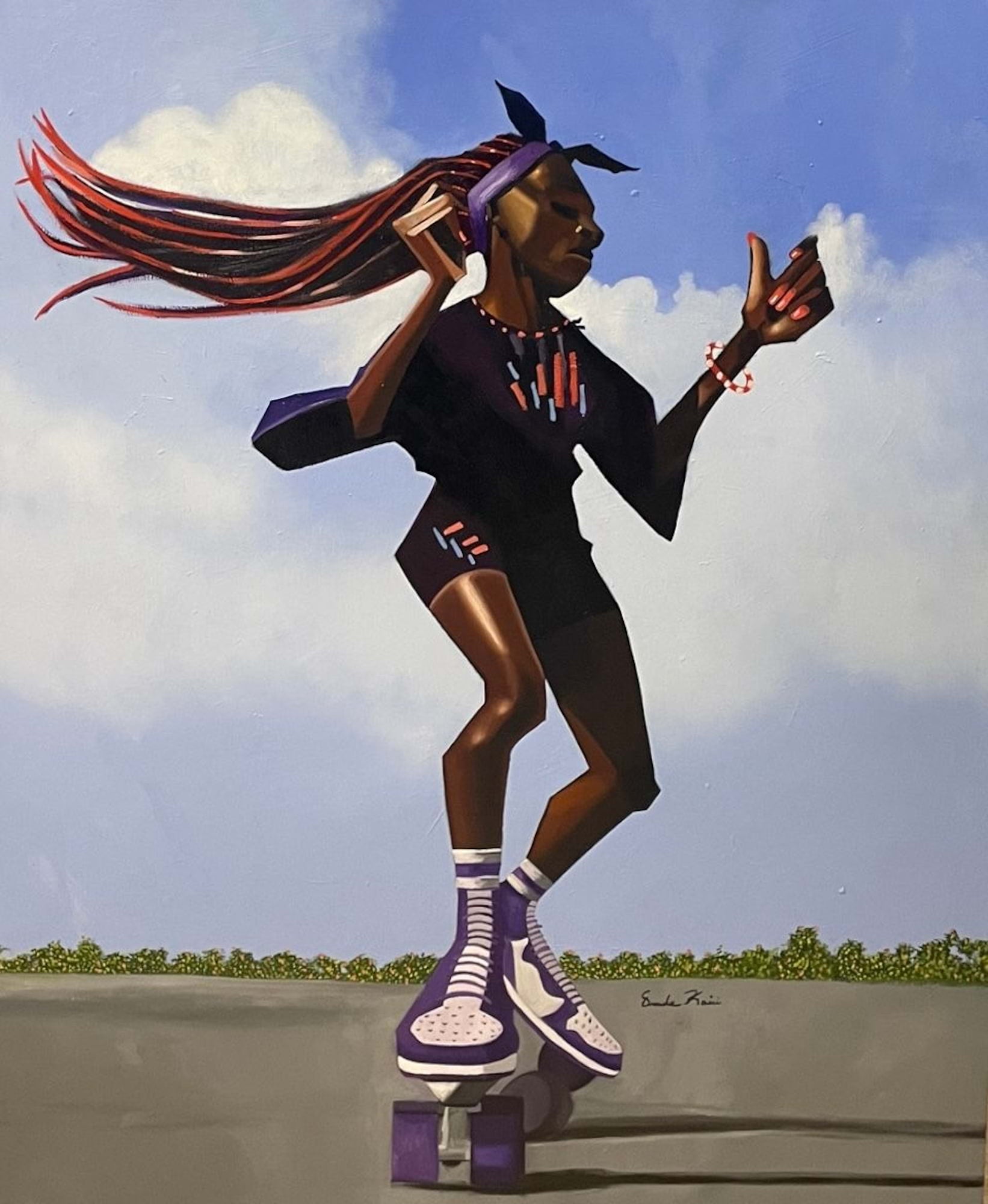 In the vibrant world of Oronde Kairi's international award-winning roller skate series, "Saturday" emerges as a captivating masterpiece. A young and spirited lady takes center stage in this artwork, embodying the pure joy of a leisurely afternoon spent gliding on wheels. Her hair flows freely in the wind, a testament to the exhilaration of movement, while her eyes remain closed, lost in the moment.